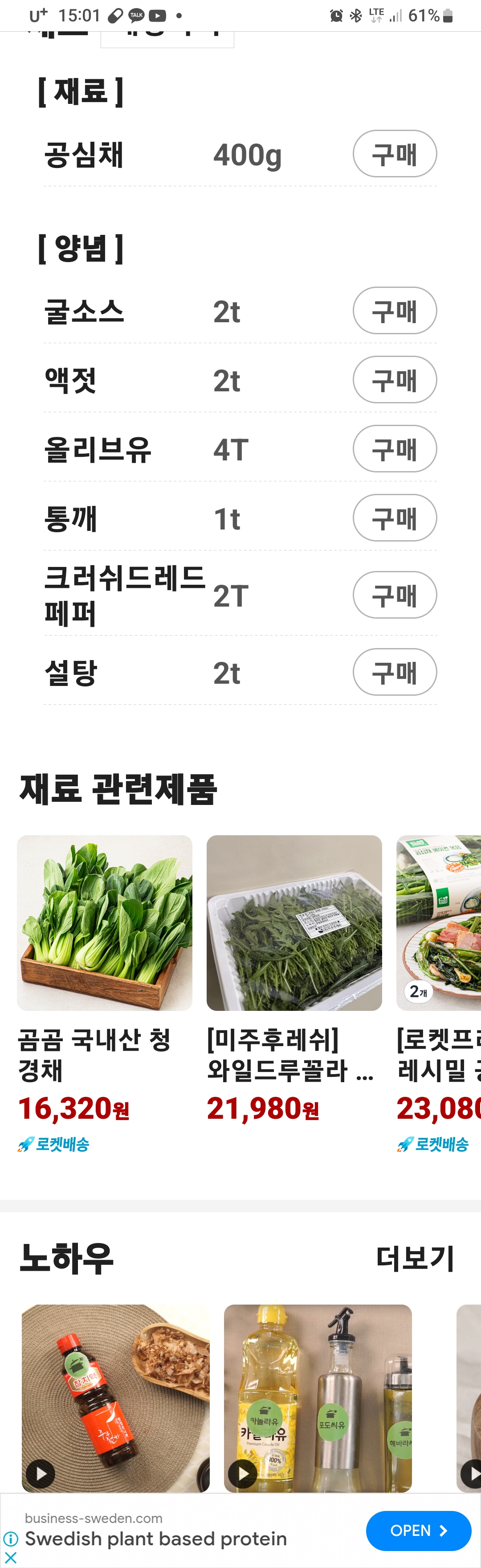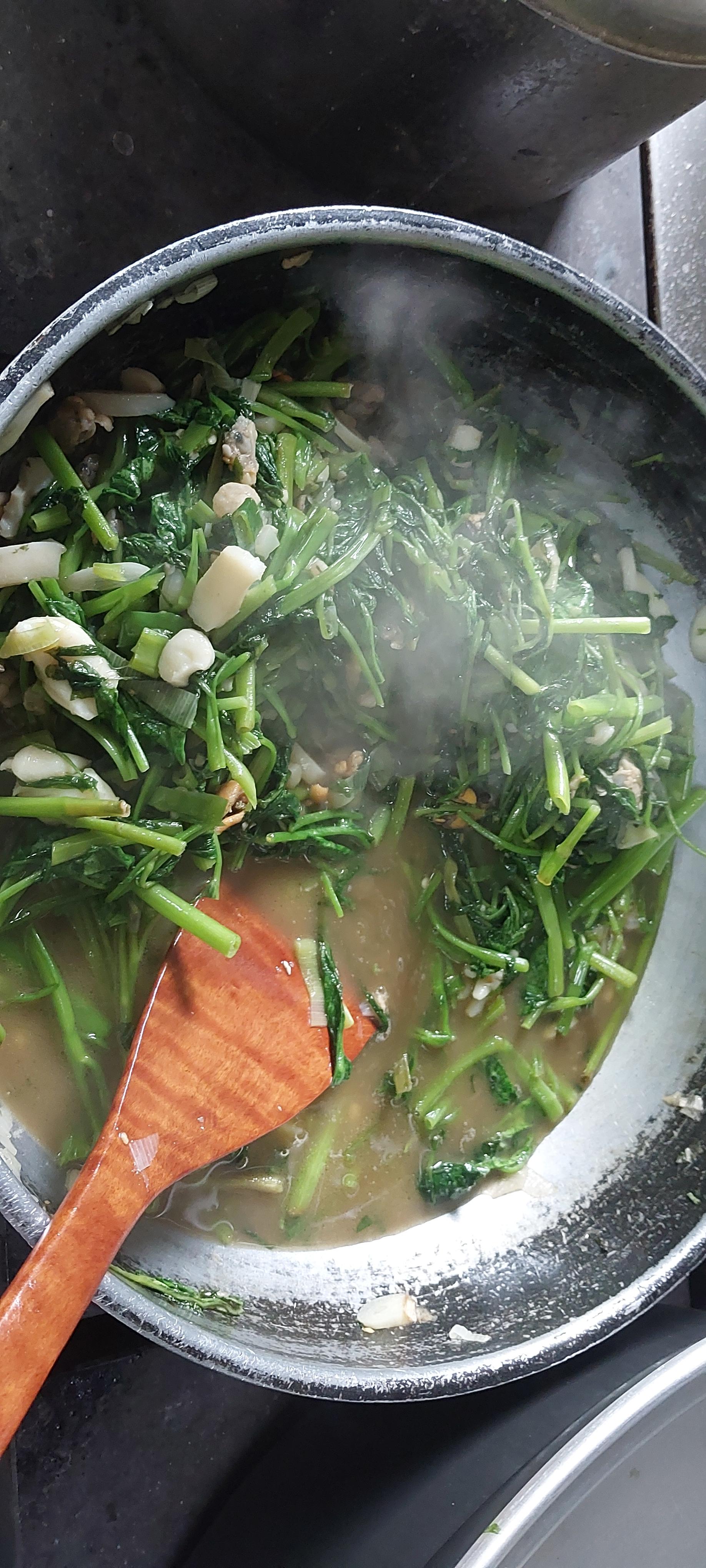 공심채는 속이 비어서 부른다. 해물을 넣어서 물이 나고 간이 싱겁다. 다음번에는 건새우나 마른 해물로 해보자.