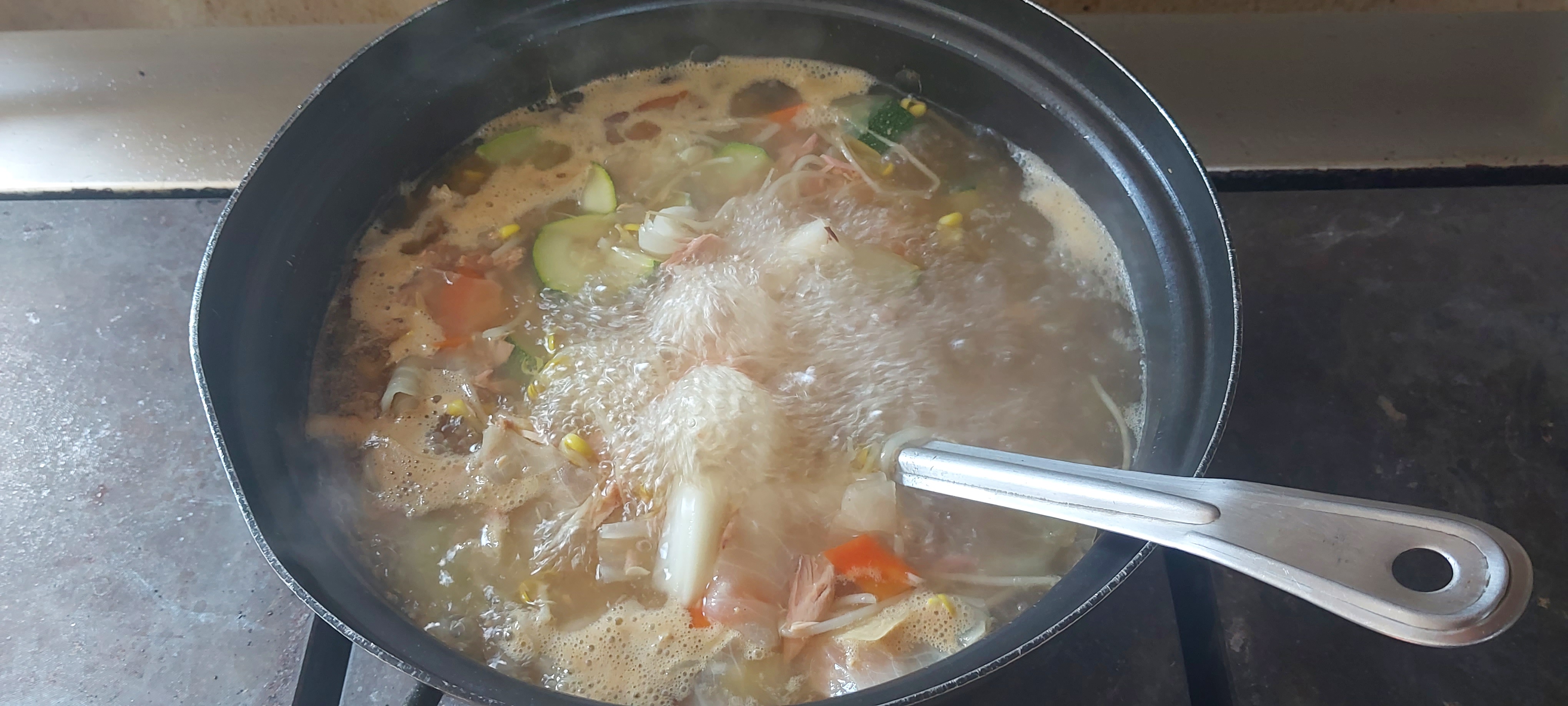 저녁때는 참치찌개다. 동원 참치 통조림 업소용. 참치전도 할 수 있다. 고춧가루 안 넣고 땡고추와 베트남 건고추로 매운맛을 냈다. 무 대신에 양배추 콩나물 주키니 호박이 들어갔다.
