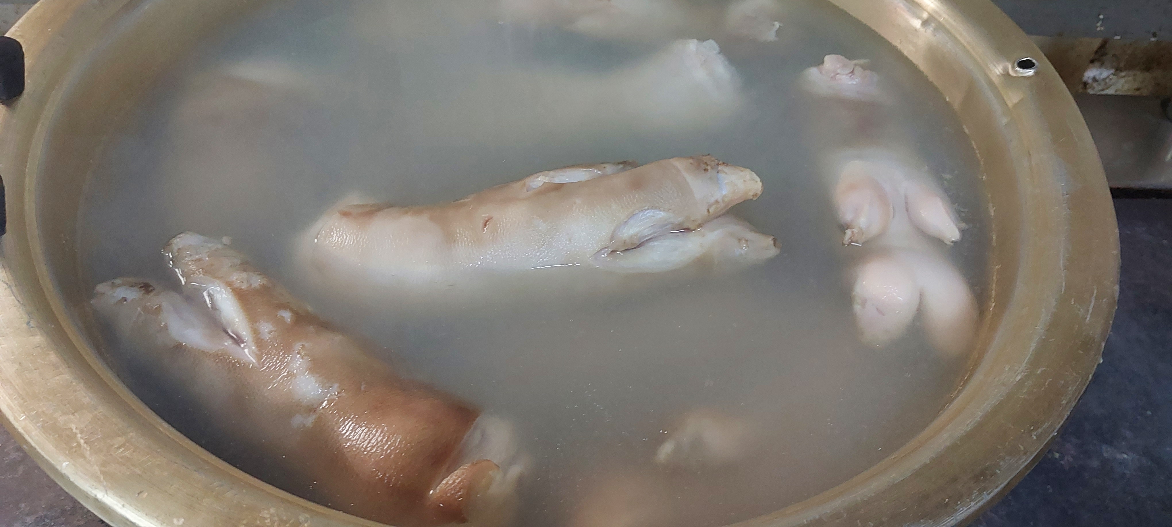 냉동된 족발을 해동시킨 뒤 한 번 삶아내고 된장과 여러 재료를 넣고 살이 부드럽게 익을 때까지 삶아낸다.