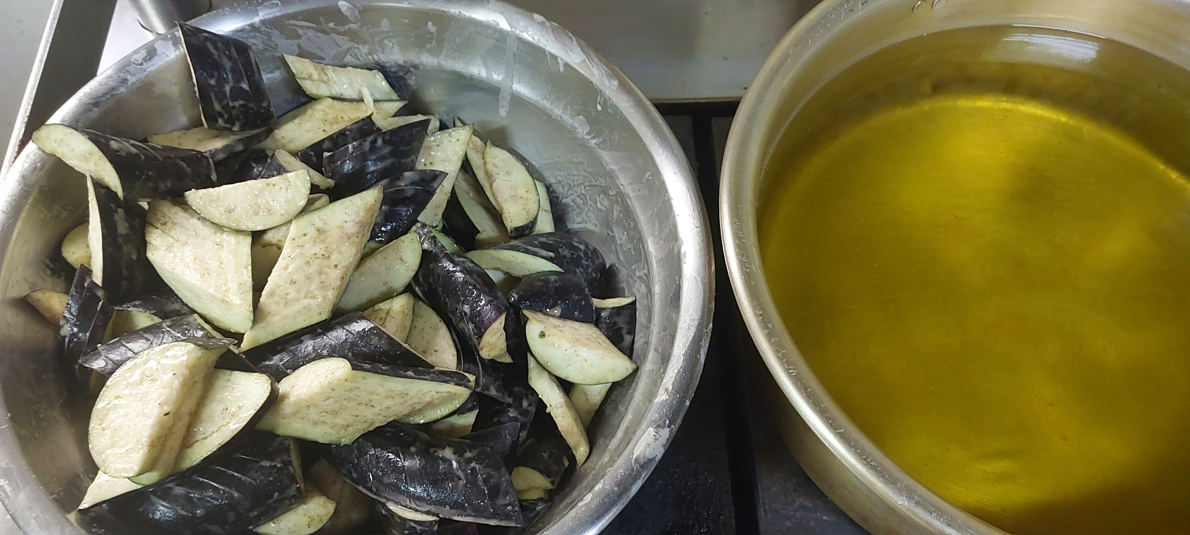 가지가 수분이 있는데 기름을 먹어서 난도가 있는 튀김이다.