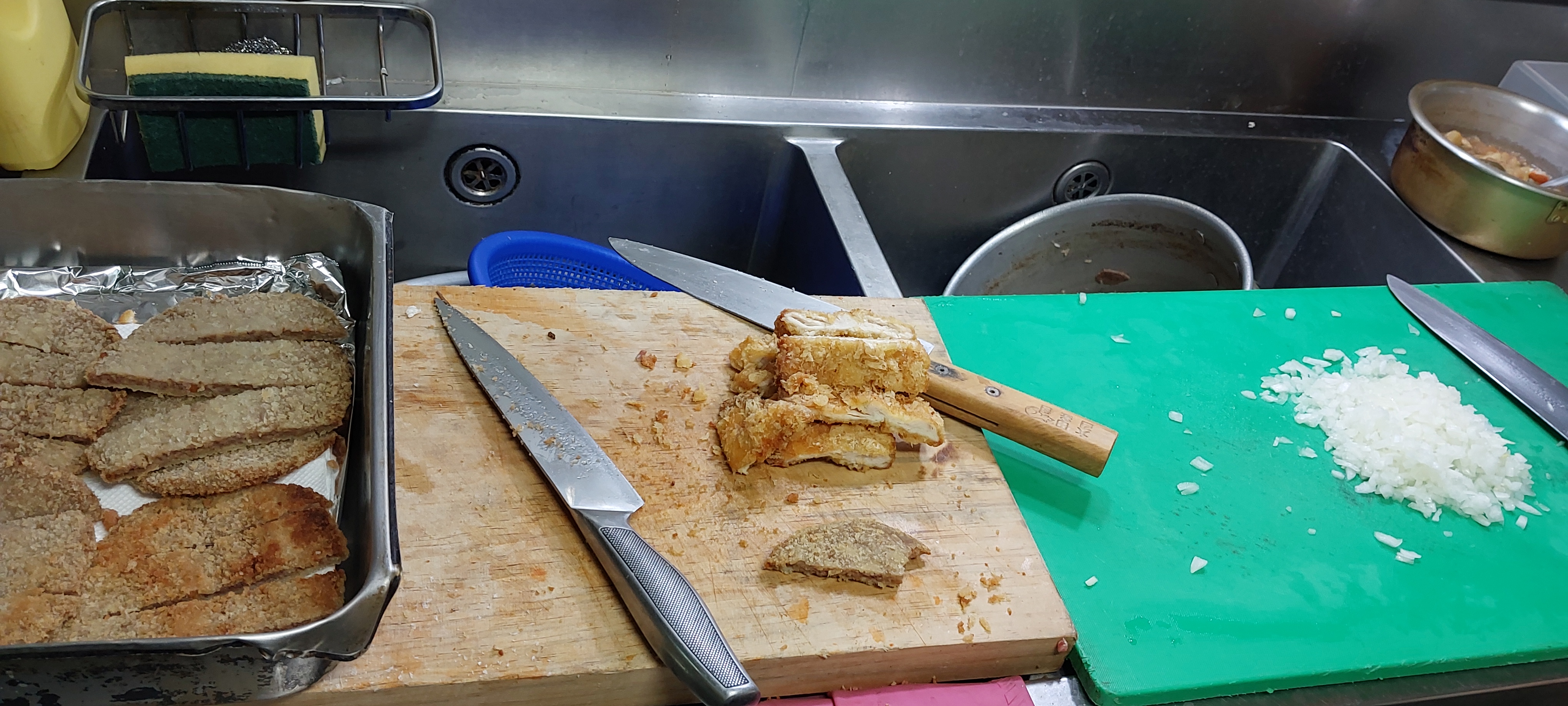 인도네시아 무슬림 선원들은 돼지고기를 않먹는다. 점심때는 생선까스를 저녁때는 소고기를 해주려고했는데 구워보니 돈등심이라 닭가슴살로 해주었다.