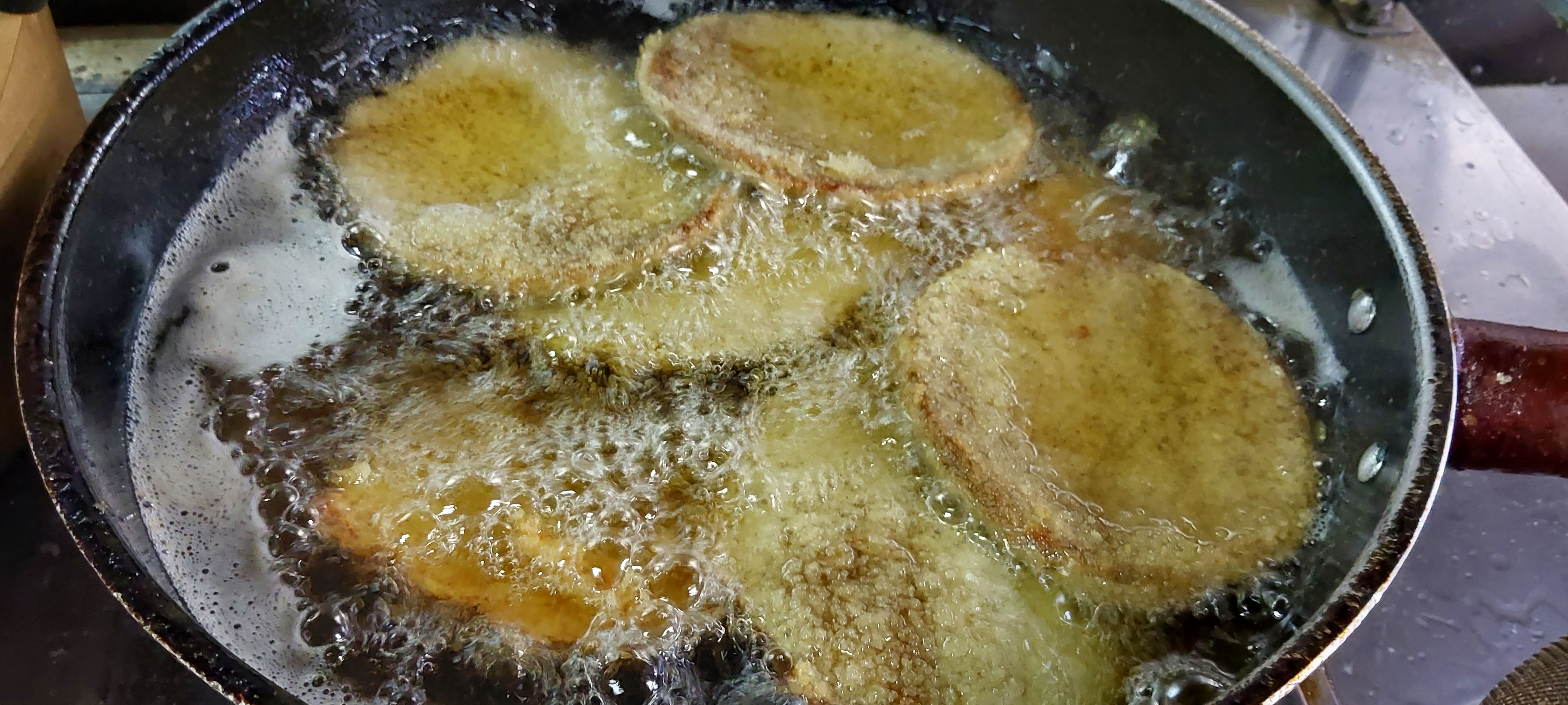 기름솥에서 튀긴다. 2번째쓰는 기름인데 아직 깨끗하다.