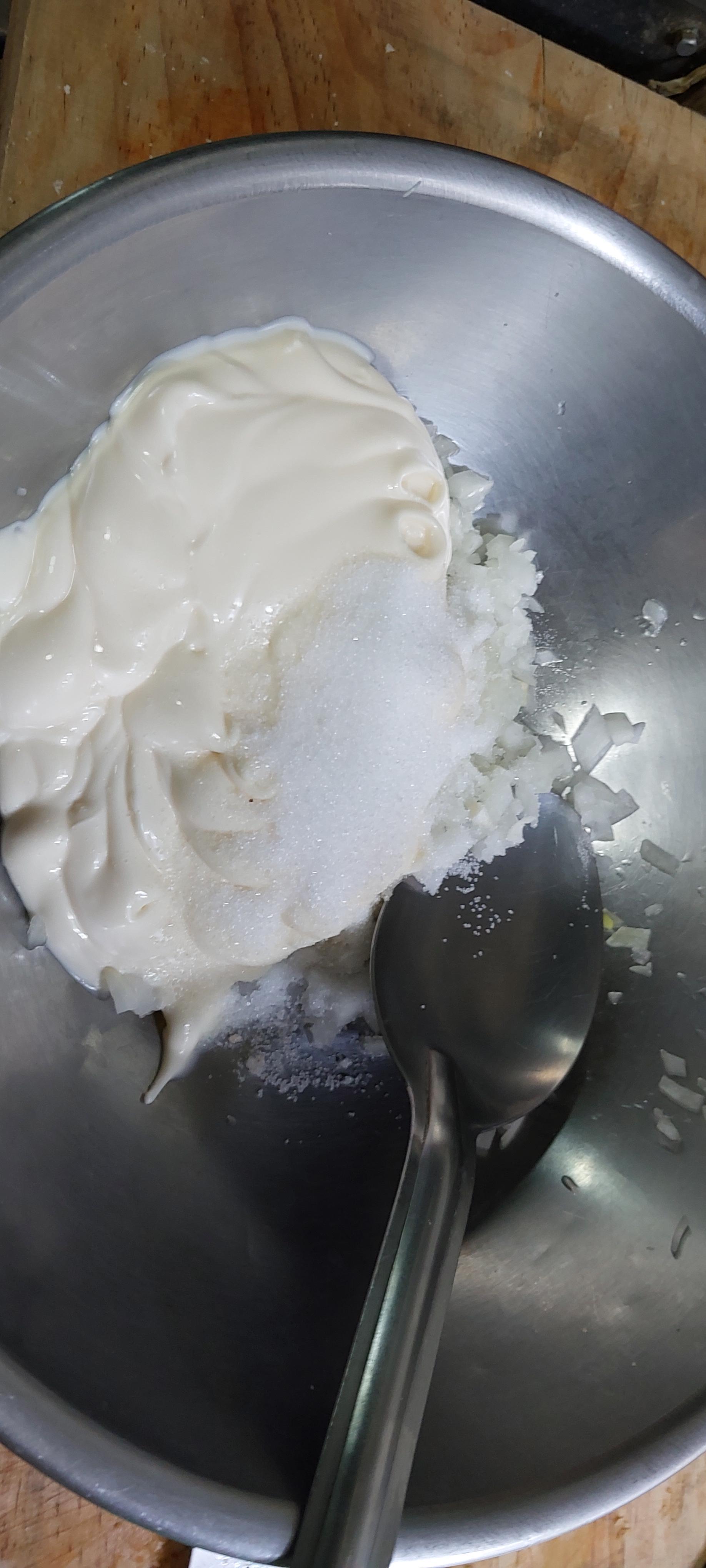 생선가스 찍어먹을 소스다.양파를 짜핑하고 마요네즈에 설탕을 넣었다. 저번에는 않만들었는데 시간은 부족해도 조금만 수고하면 선원들과 나도 맛있게 먹을수있어 하나라도 더 많들어먹자가 본선 조리장 폴리쉬 정책이다^^