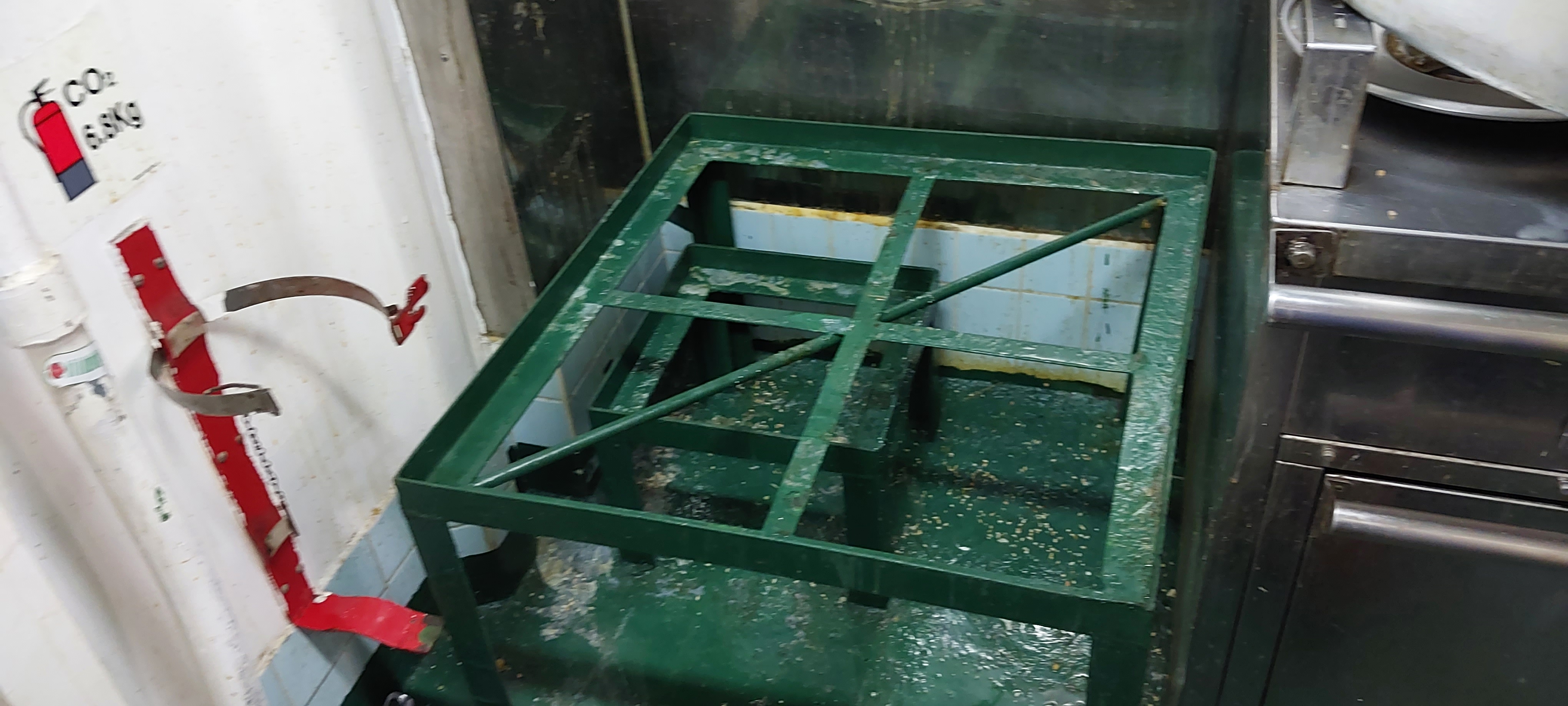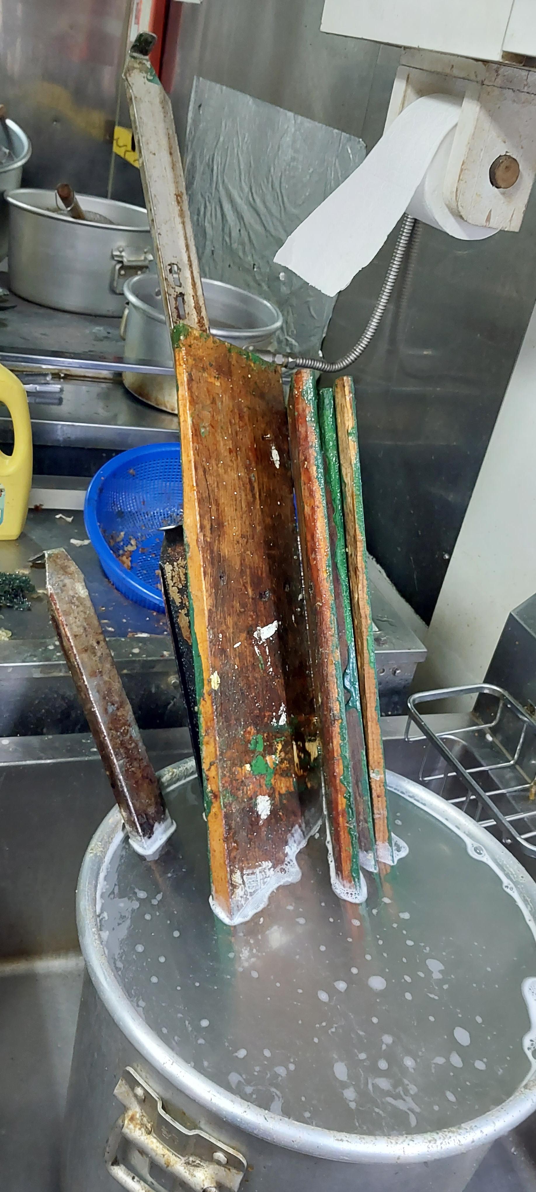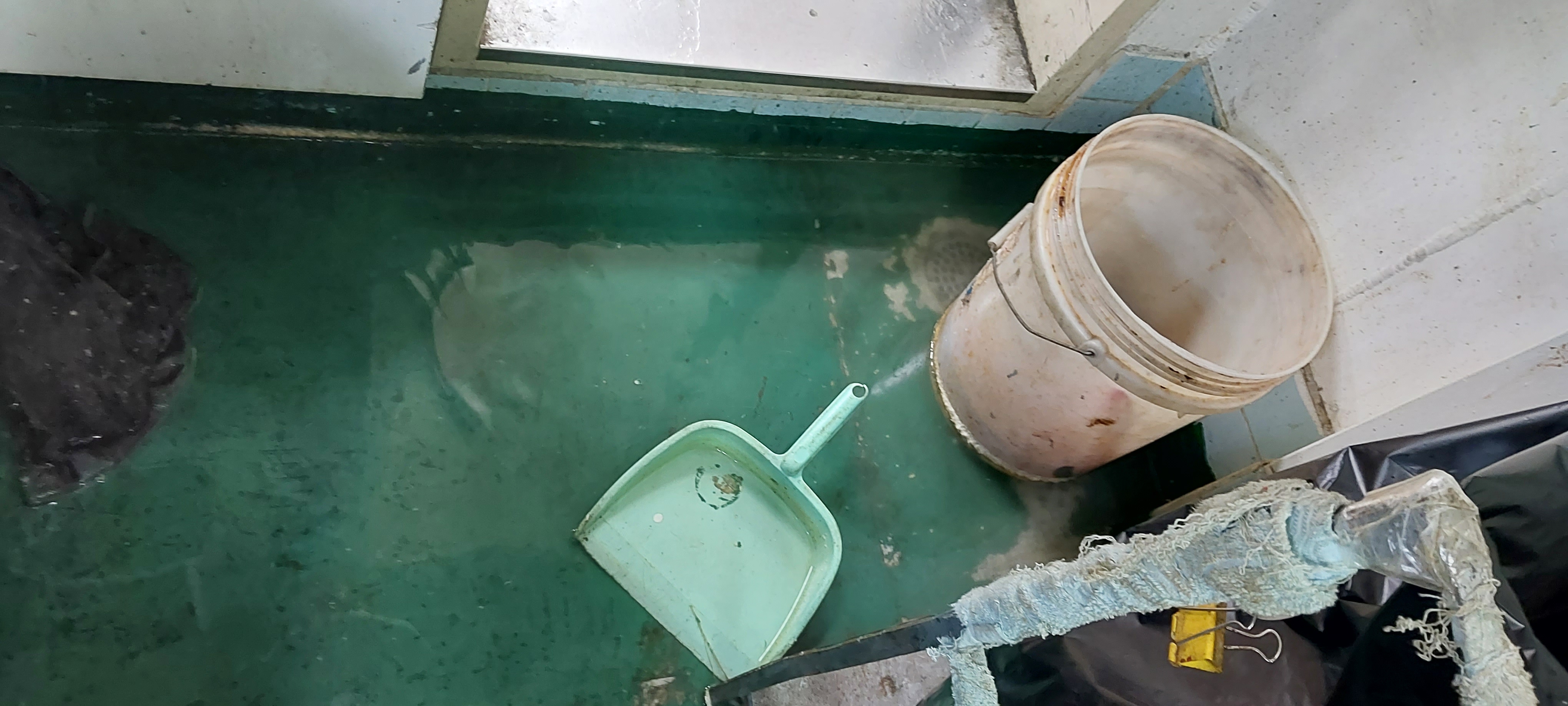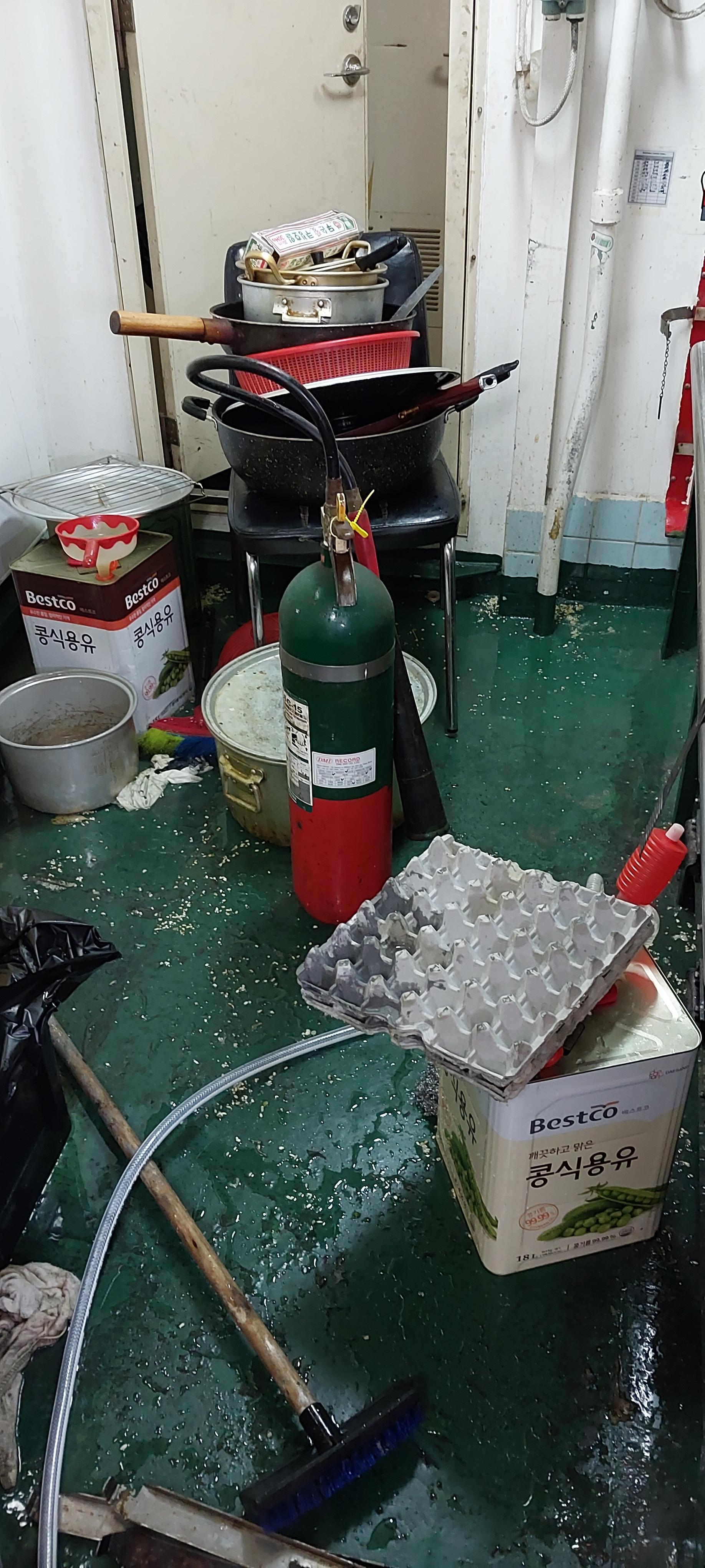이 배는 주방 동선이며 공간이 최악이다. 거기다 하수도 배관까지 막혀 이 모양이다.