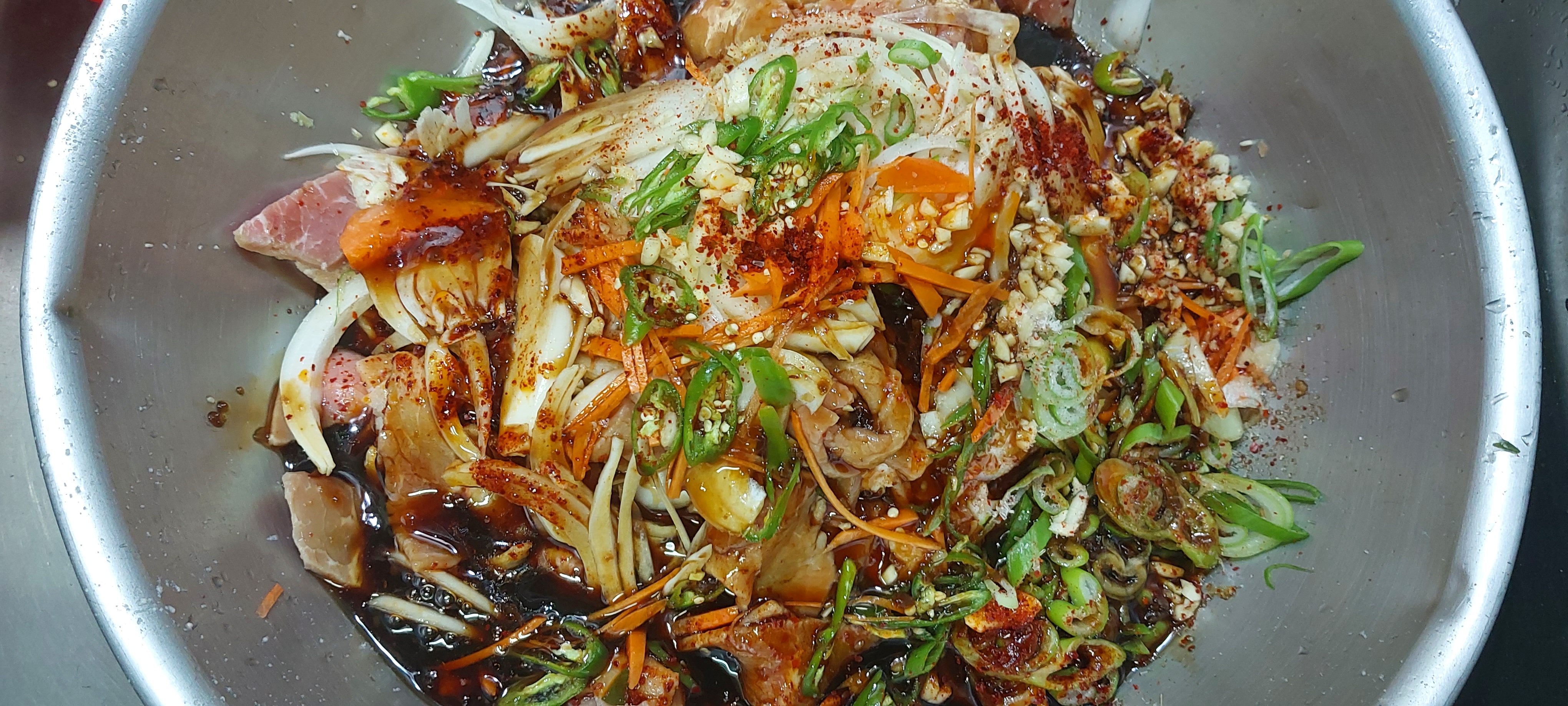 등심과 통삼겹살을 썰은 뒤 핏물 빼고 깨끗하게 씻어 물기를 뺀다. 육고기는 바로 굽기보다 이런 과정을 거치면 위생적으로나 소화나 양념이 잘된다.