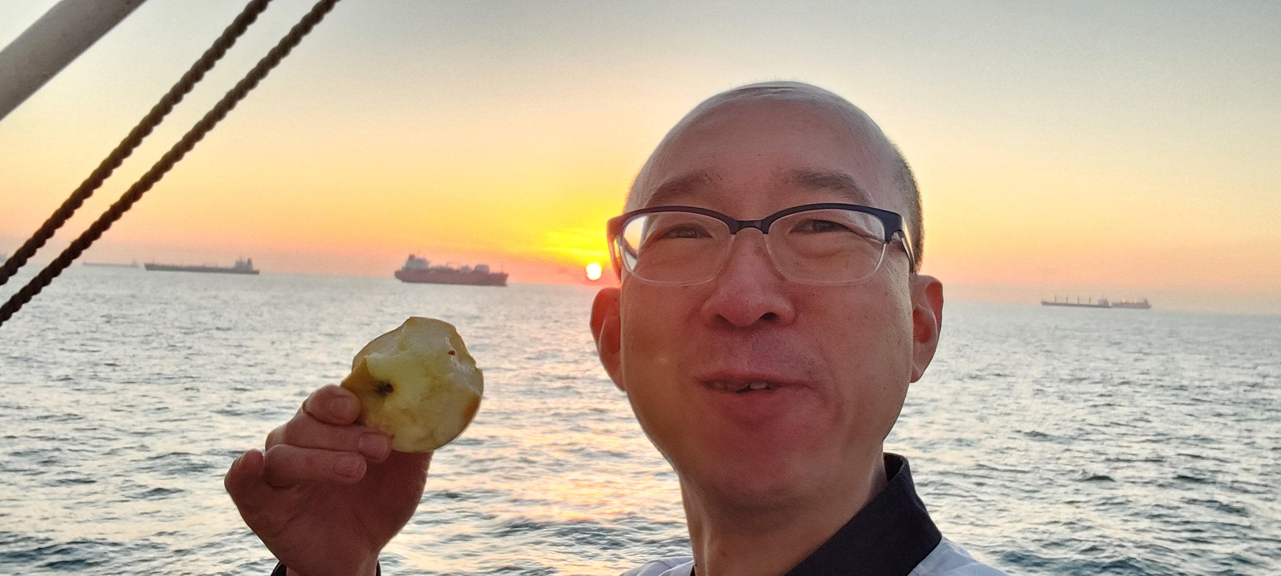 아침 🍎 사과 먹고 힘이 난다. 아침에 갑판장 하고 말다툼하고 시비가 붙어 기분이 안 좋았는데 이런 바다와 해를 보면서 마음을 다스리고 어쨌든 하루를 살아본다.