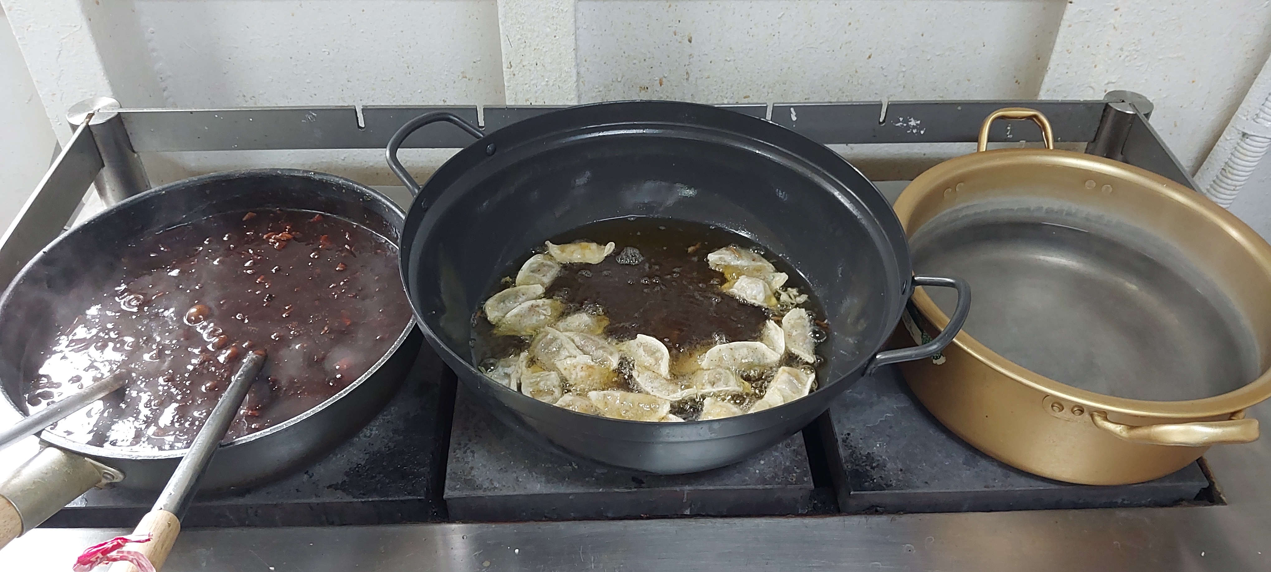 이렇게 동시에 여러 가지를 혼자서 해낸다. 만두 튀기고 춘장 볶고 면삶는다.