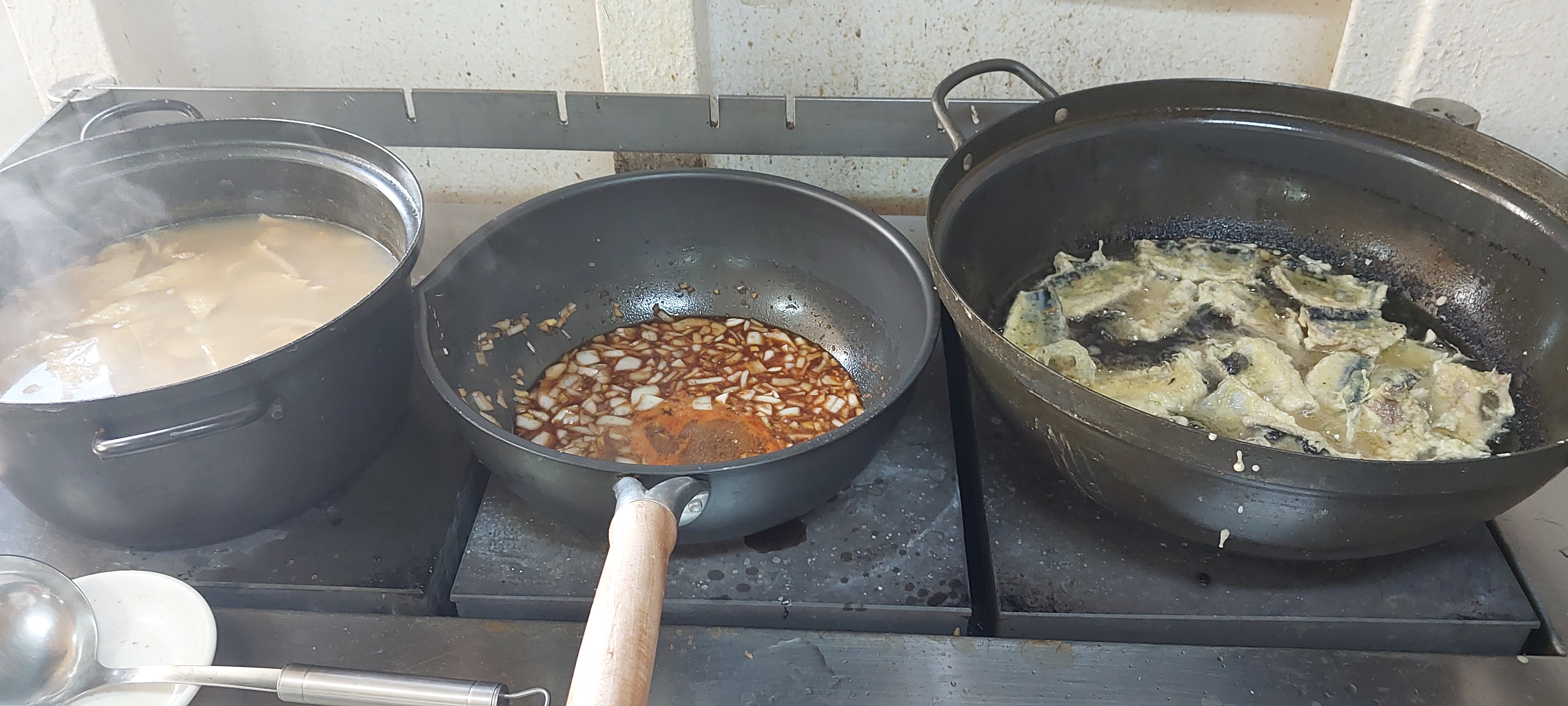 가지고 온 요리책을 참조해서 처음으로 만들어봤다. 실제 현장에서는 재료나 분량이 다르기 때문에 운용을 해야 한다. 양파즙이라고 했지만 그냥 썰었고 녹말가루 대신 밀가루에 옥수수 전분을 썼다.