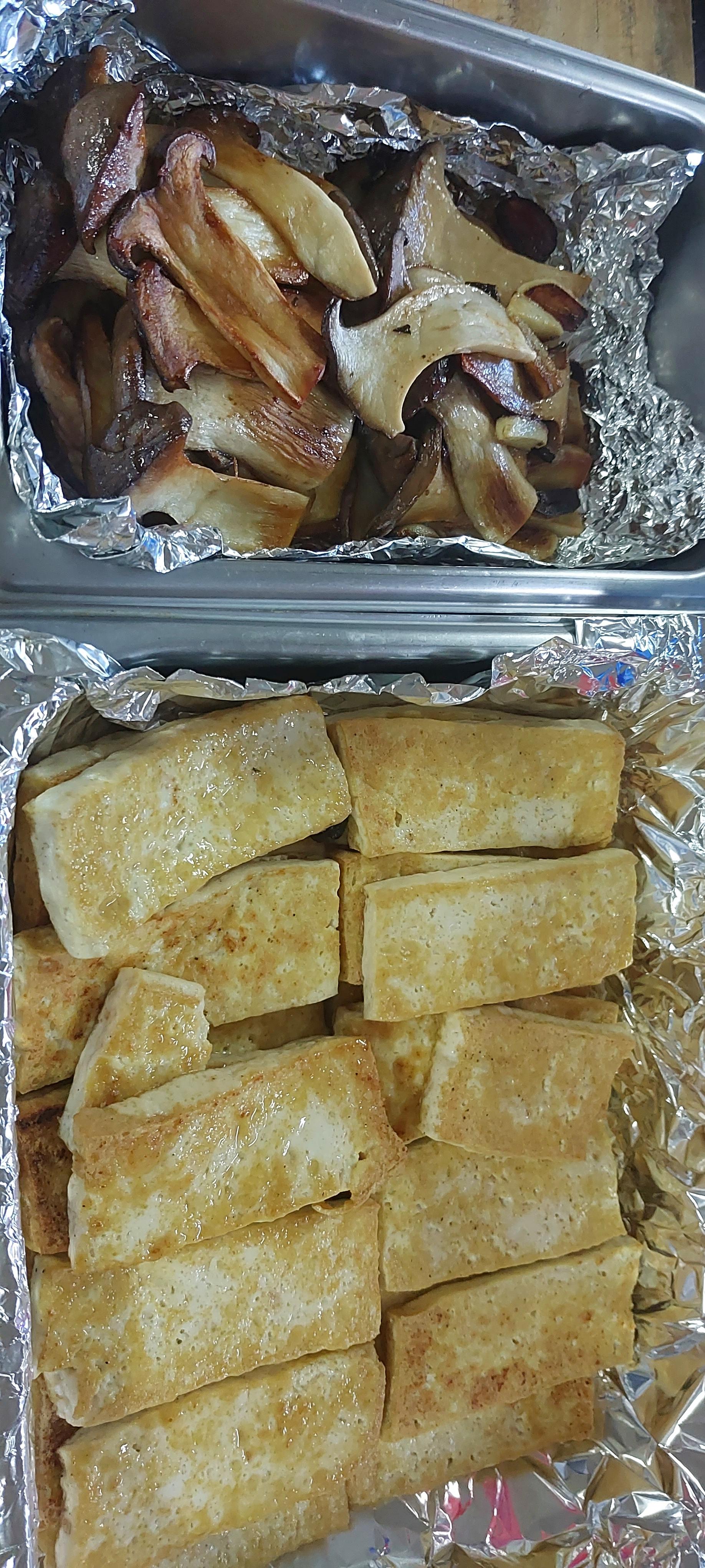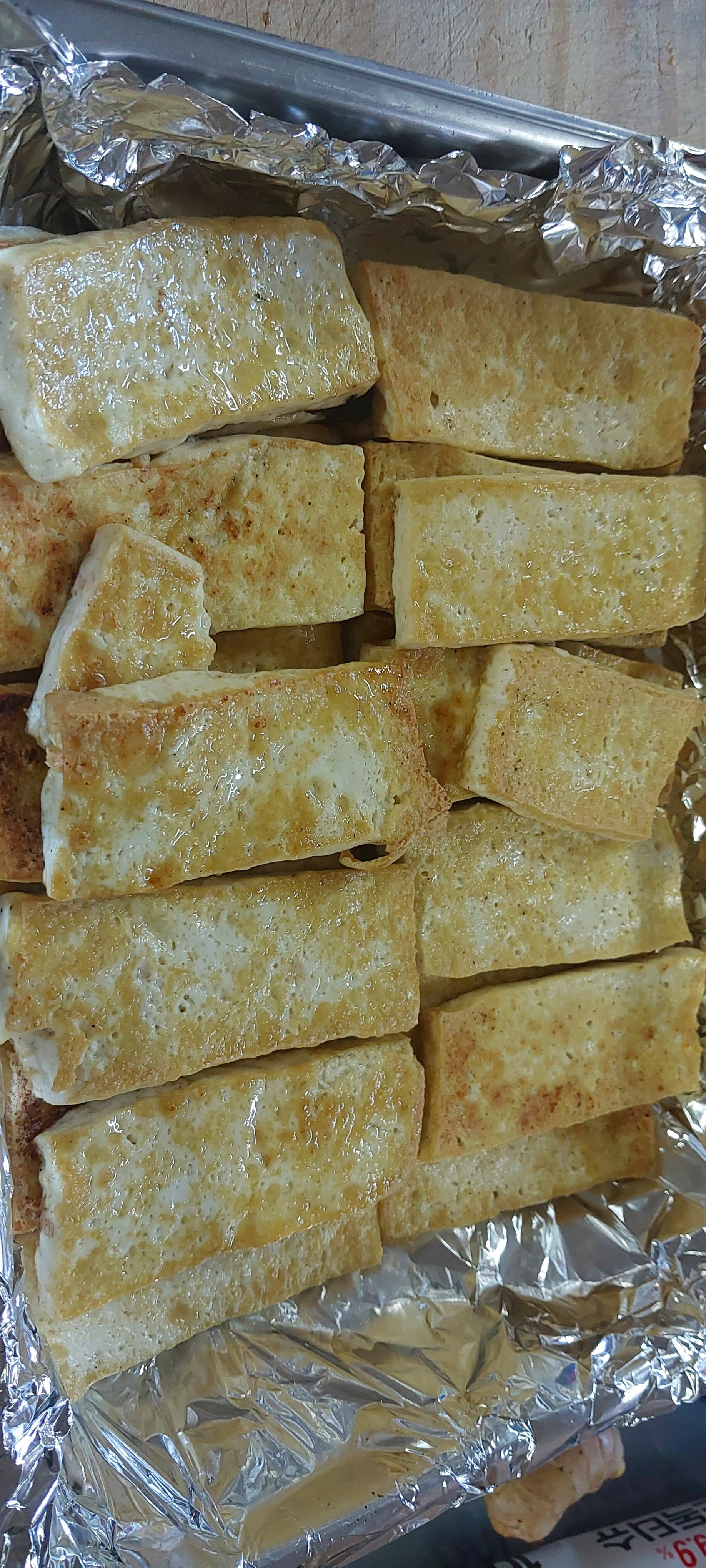 두부는 아침 끝내고 미리 썰어놓고 소금을 뿌려주면 점심할 때 바로 구울 수 있다.