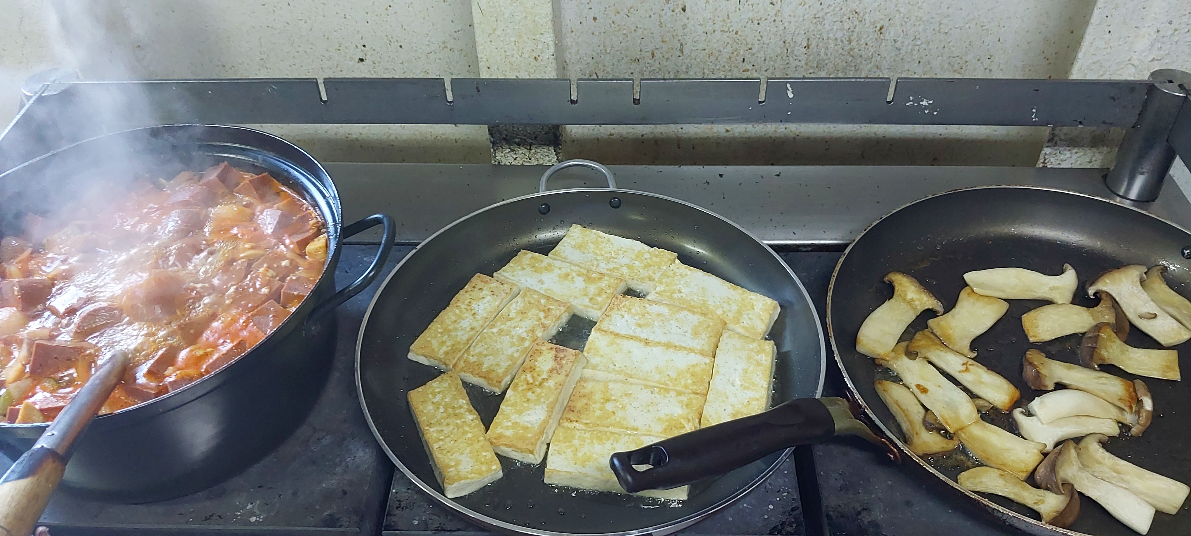 이렇게 국과 반찬 두 가지를 동시에 한다. 밥은 전기밥솥이 하고 있다.